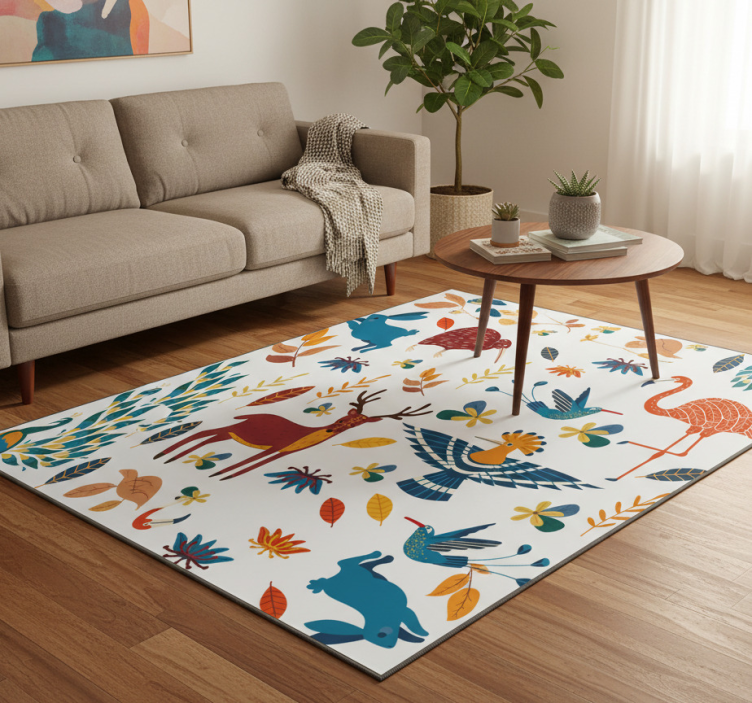 Using the Floral vinyl rug with tengango style animals and plants floral vinyl rug for decoration enhances your space with its unique charm and character. The lively colors and enchanting patterns invite warmth and creativity, making it an ideal choice for living rooms, bedrooms, or play areas. Its captivating design not only brightens up your space but also serves as a beautiful conversation starter!