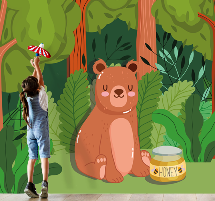 Transform your child's space with our Childrens wall mural adorable bear artwork. This enchanting design features a delightful bear surrounded by a lush forest, sweet honey, and playful wildlife, creating a captivating atmosphere that brings nature indoors. The charming illustration of animals in their natural habitat is sure to ignite your child's imagination and add a touch of whimsy to their room!