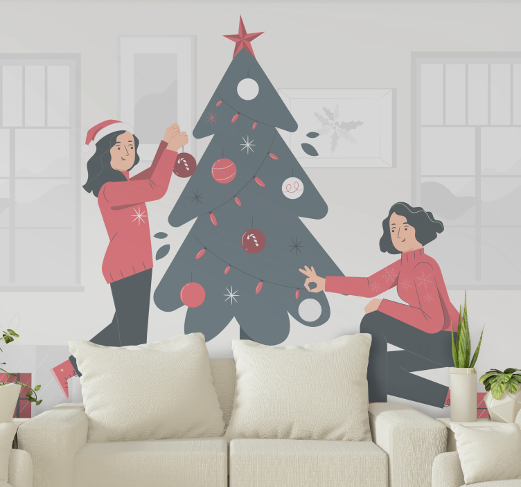 This winter wonderland wall mural features a beautifully decorated Christmas tree with high levels of detail. Don't settle for a boring tree and lights, customize the look of your walls and fill them with the Xmas spirit. This design depicts two women decorating a cartoon Xmas tree with red and white decorations.