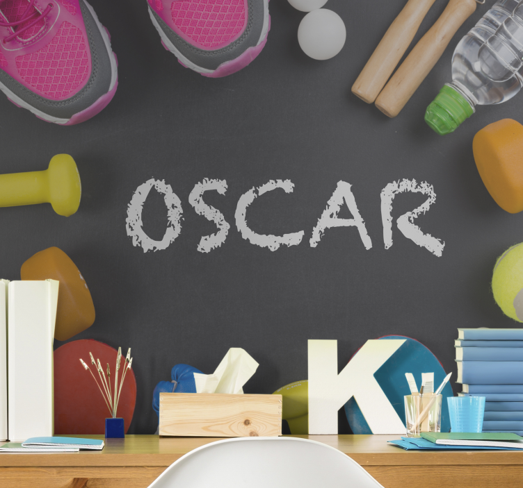 Introducing the Abstract wall mural fitness essentials showcase, a vibrant and energetic design that celebrates the spirit of fitness and sports! This captivating mural features an array of sport elements, including weights, shoes, and a water bottle, all presented in a custom, personalizable format. With a fun blackboard style, you can even add your own name to make it truly unique. Transform your space into a motivating environment that inspires exercise and healthy living!