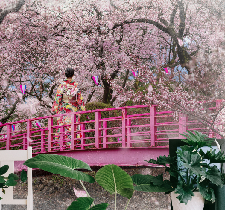 Transform your space with our stunning Flower wall mural cherry blossom landscape. This exquisite design features a serene landscape adorned with delicate cherry blossoms, a picturesque bridge, and elegant trees that evoke the beauty of an Asian garden. The soft pink flowers and traditional outfits depicted in this Japanese-style mural create a calming atmosphere, perfect for any home or office.