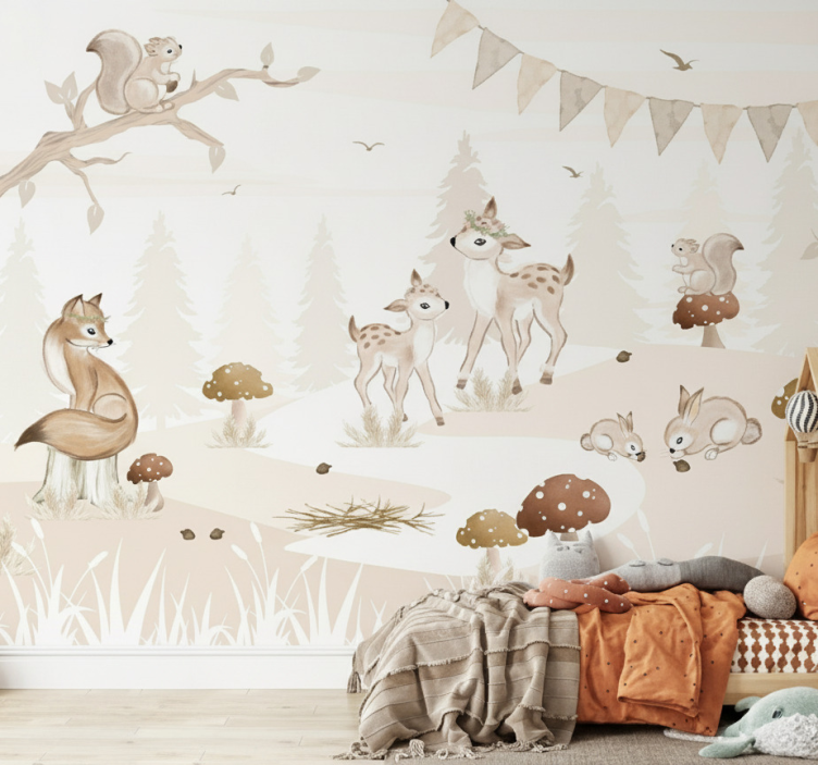 Reference: F11906Transform your child's nursery into a magical retreat with our Forest wall mural whimsical woodland nursery. This stunning design features enchanting forest scenes filled with vibrant wildlife, tall trees, and playful colors that create a serene yet whimsical atmosphere. Ideal for sparking imagination, this mural is crafted in matt colours using high-quality non-woven wallpaper that adds depth and warmth to any space.
