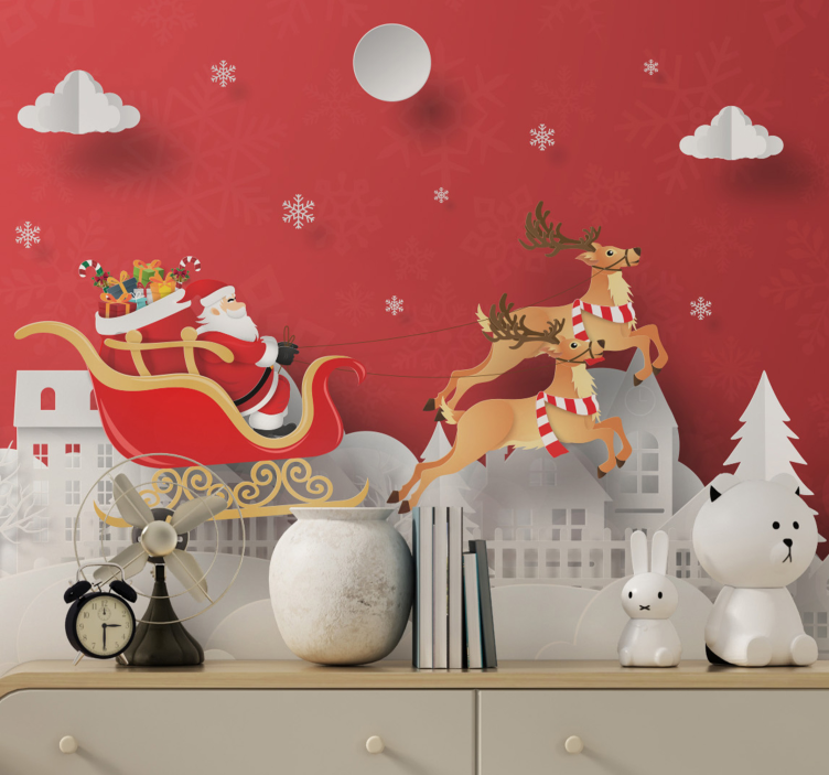 Our wall mural is an original design that will add a touch of Christmas spirit to your home. The beautiful scene features Santa and his reindeers flying through the snowy sky, surrounded by a winter wonderland landscape.