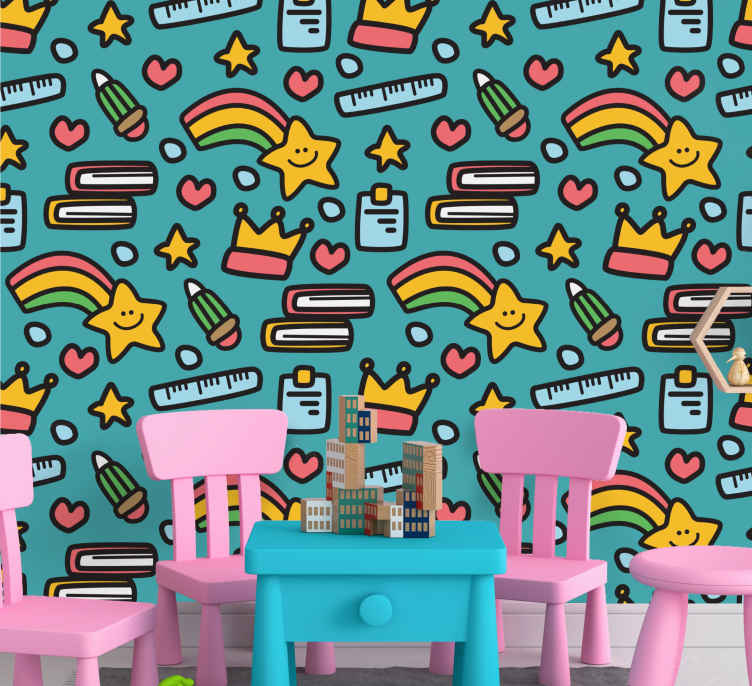 Create a wonderful and fantastical space for your child with this featured happy rainbow and stars pattern wallpaper design. The funky colours and other illustrations will add a playful touch to any room. This wallpaper is easy to apply to the wall and can be removed anytime without any hassle. Browse our selection of other children wallpaper designs on our website to customize your kid's space.